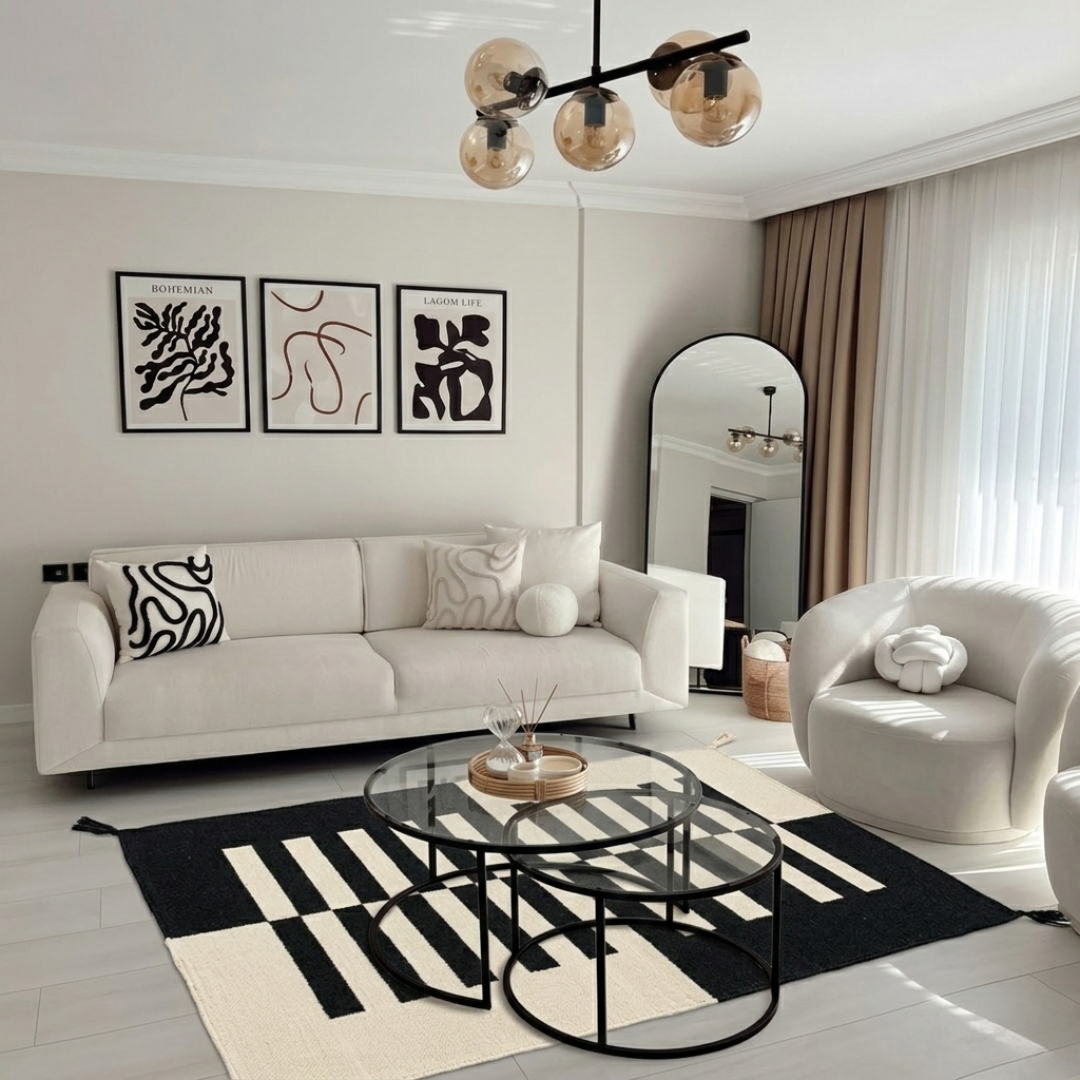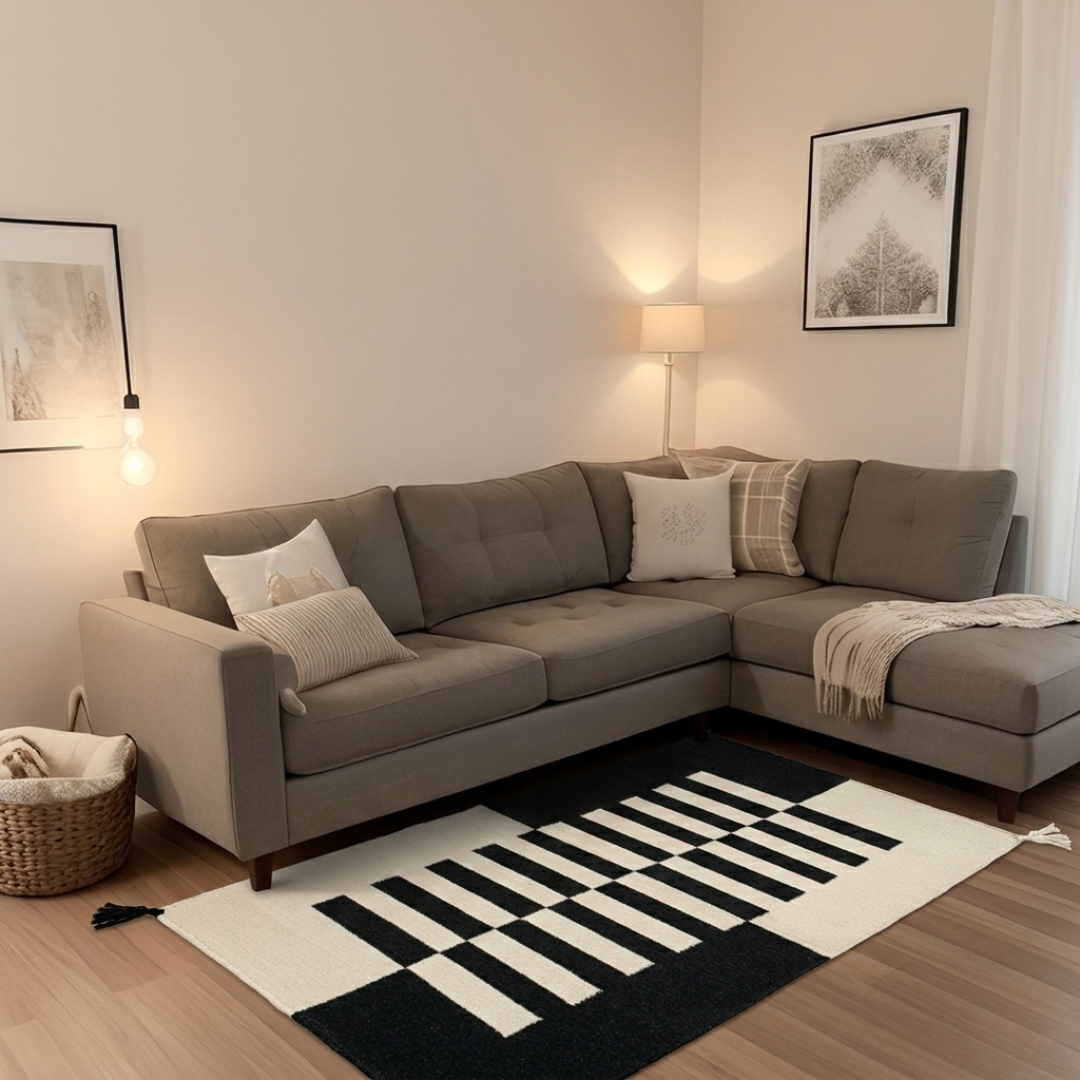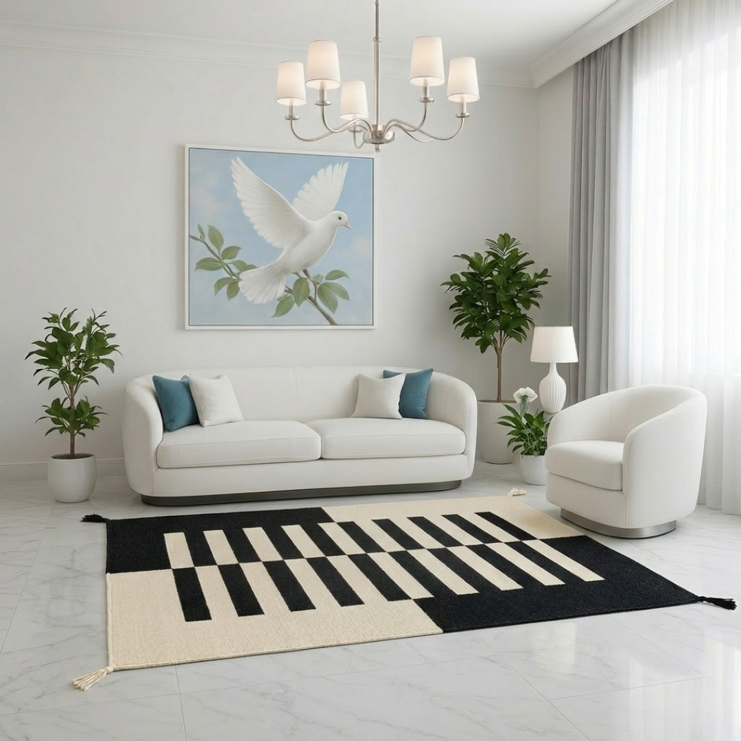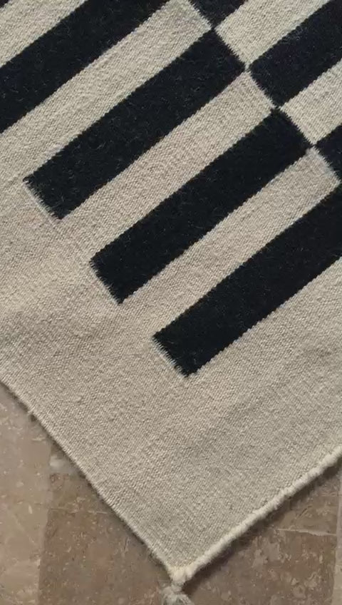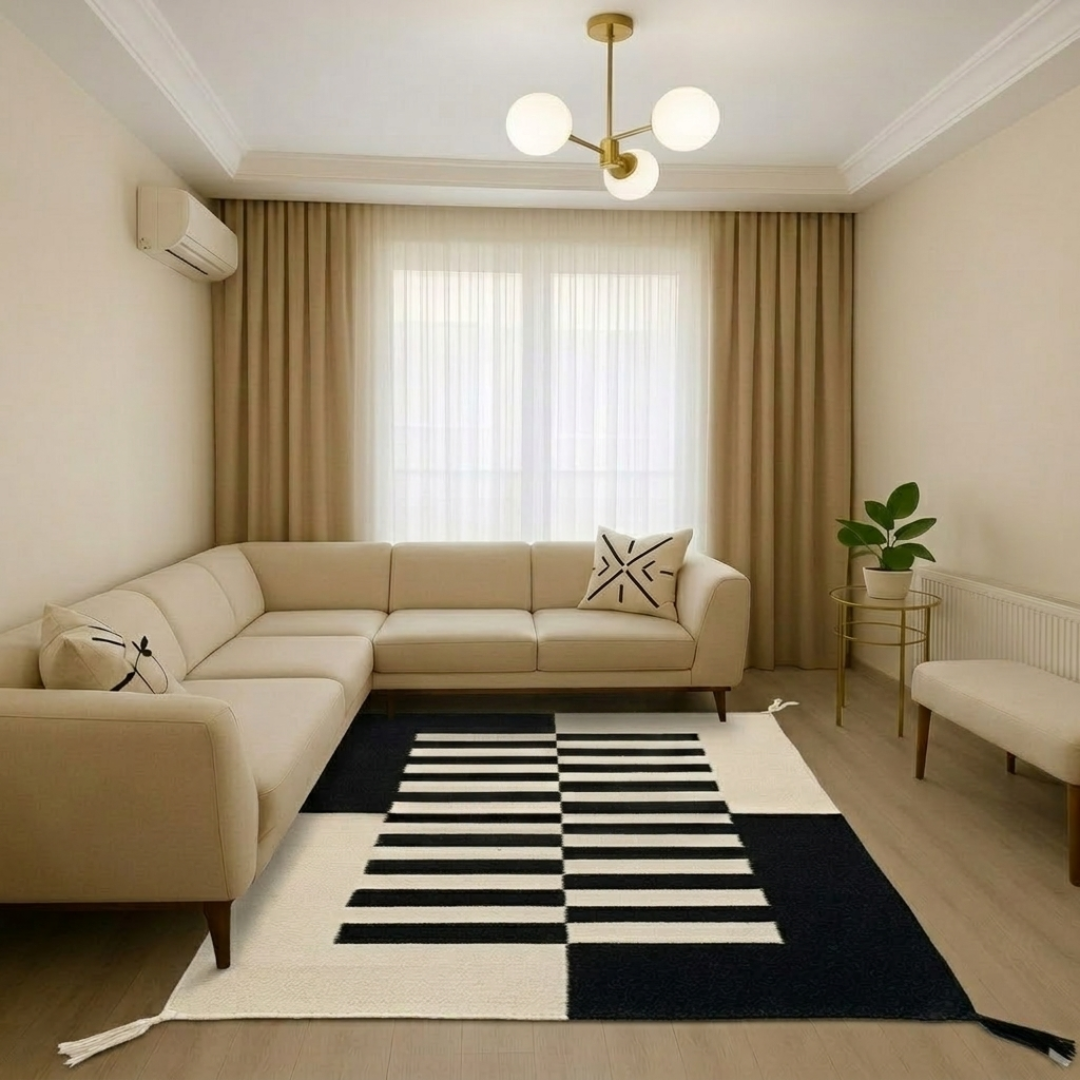 Discover refined elegance with this handcrafted rug showcasing a striking black and white dual-tone stripe design. Measuring 2.5x4 feet, this artisan-woven piece brings architectural sophistication to any room. The bold contrast of split stripes creates visual interest while maintaining a timeless aesthetic that complements both contemporary and classic interiors. Meticulously crafted by skilled weavers using traditional techniques, each rug demonstrates exceptional attention to detail and superior craftsmanship. An investment in quality that transforms your space with understated luxury and enduring style.