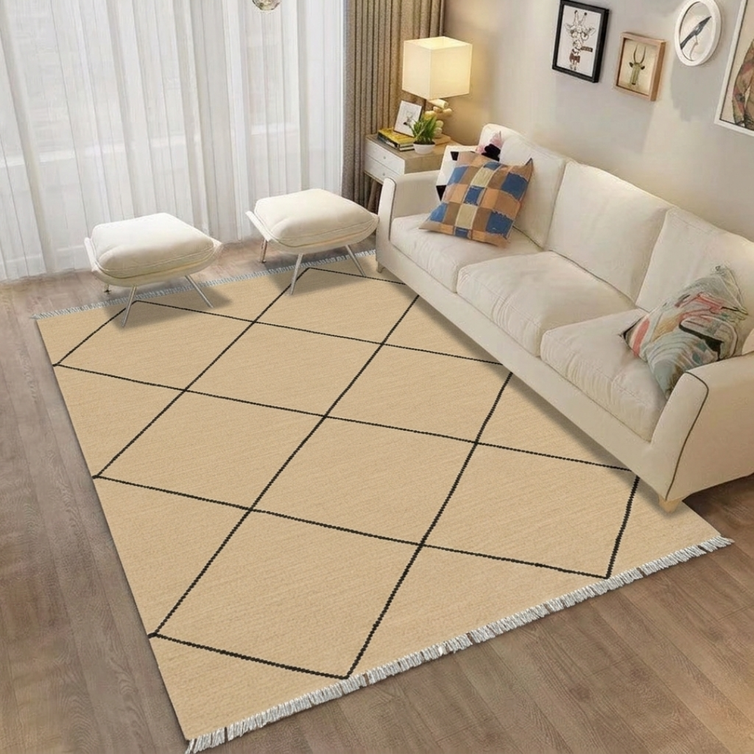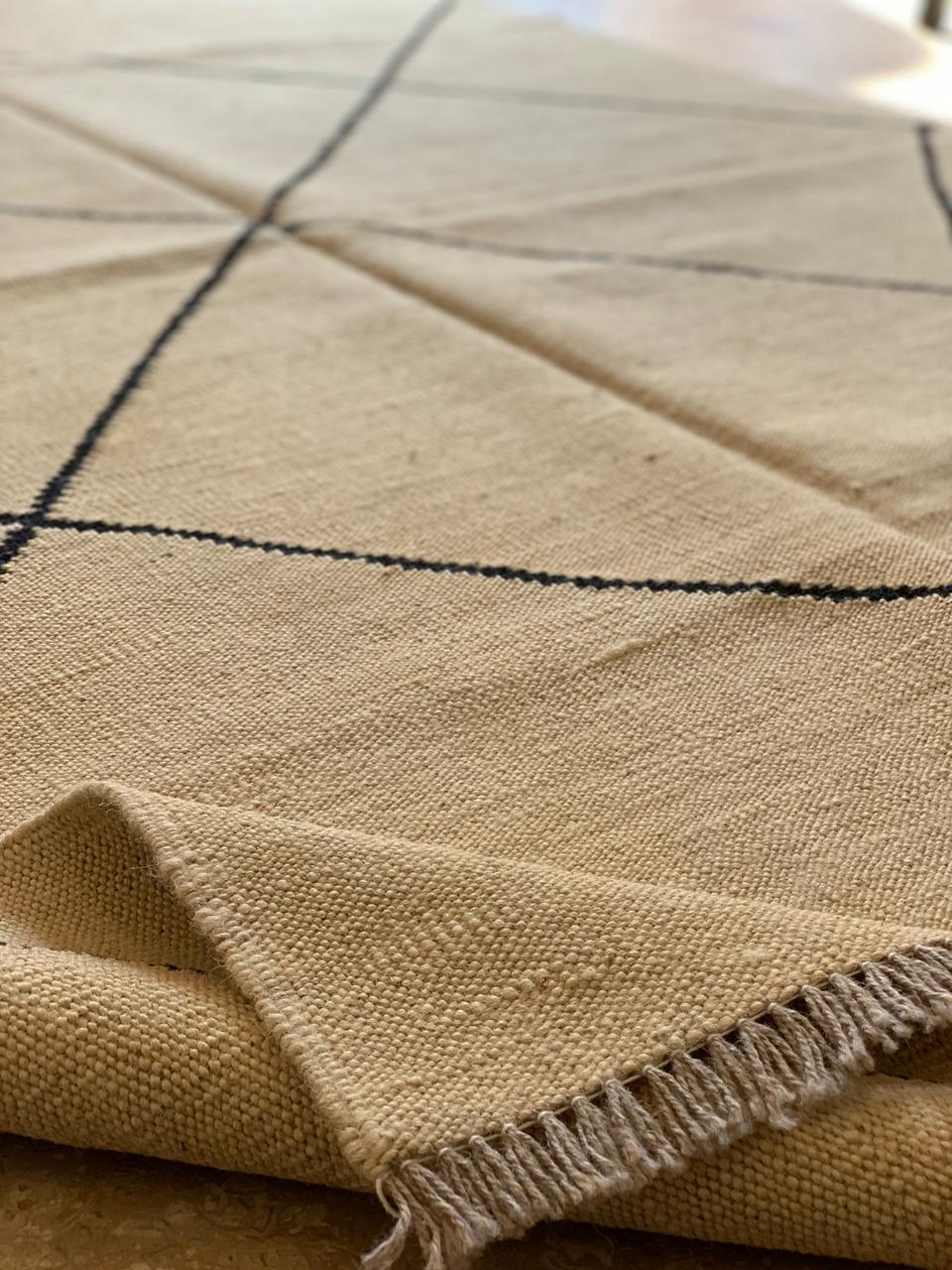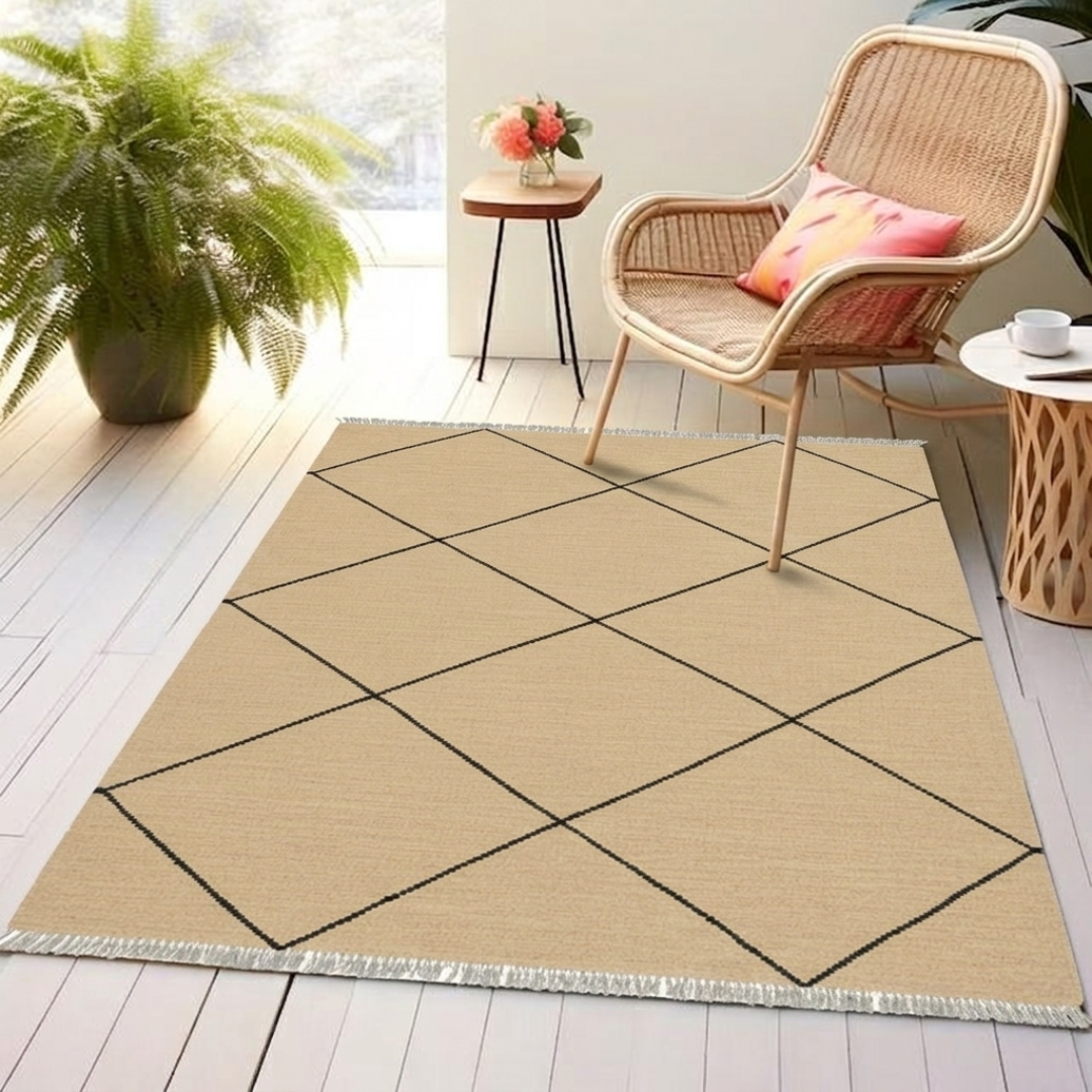 Discover the timeless elegance of this handcrafted kilim, where traditional weaving techniques meet contemporary design. Featuring a striking diamond weave pattern meticulously created by skilled artisans, this 4x6ft piece showcases premium wool in rich, natural tones. Each kilim is uniquely woven, bringing authentic character and warmth to any space. Perfect for adding cultural depth to living rooms, bedrooms, or studies, this versatile floor covering combines durability with artistic craftsmanship. A testament to heritage weaving traditions, this kilim transforms interiors with understated sophistication and enduring quality.
